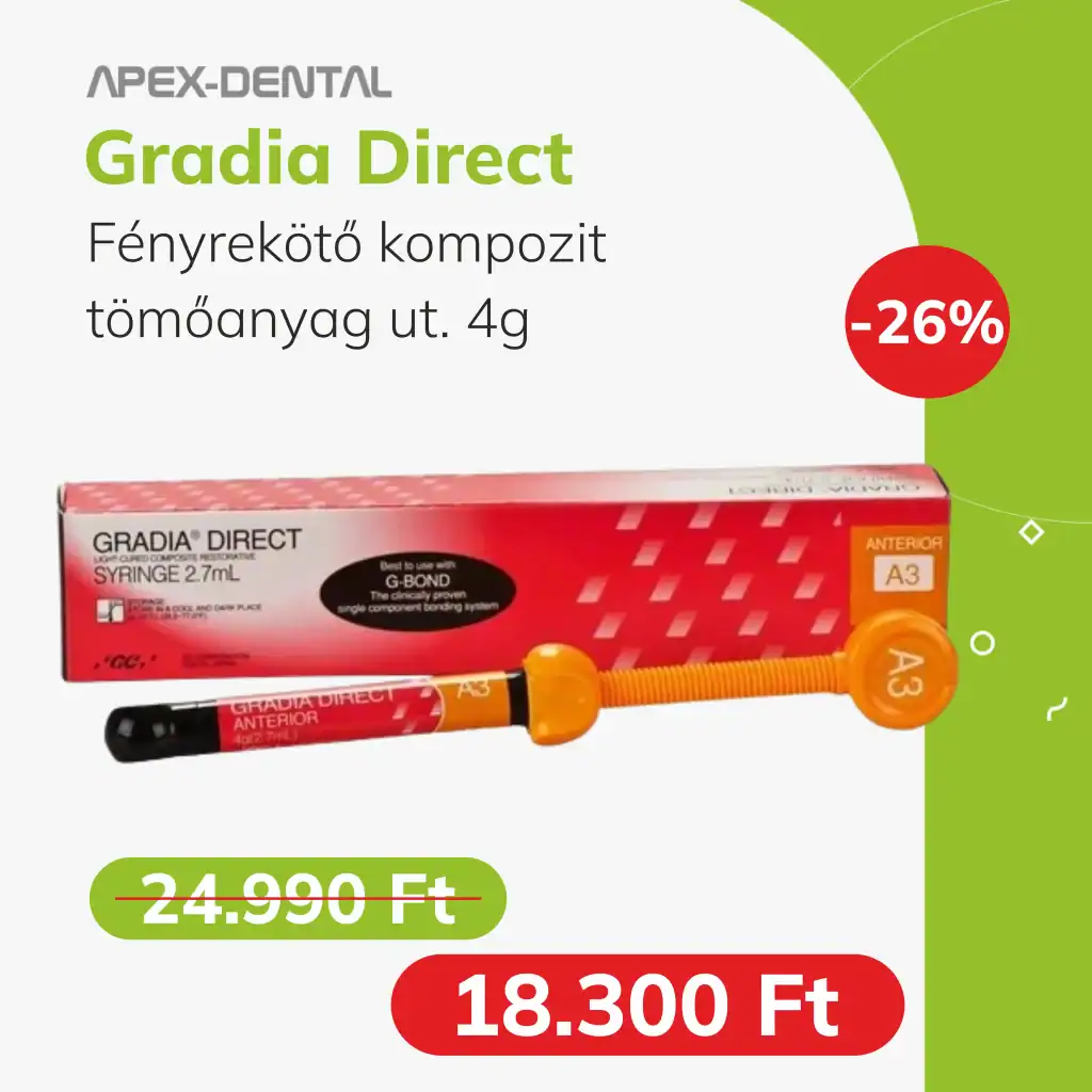 A Gradia Direct többféle árnyalatban elérhető mikrohibrid kompozit, amely természetes fényáteresztésével és kiváló polírozhatóságával esztétikus anterior és poszterior restaurációkat tesz lehetővé. Kiegyensúlyozott viszkozitása és hosszú felhasználási ideje megkönnyíti a rétegzési technikák alkalmazását a praxisok mindennapjaiban.