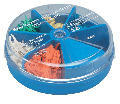 Válogatott méretkínálatú interdentális faék szett a matrica stabil rögzítéséhez és a megfelelő approximális kontakt kialakításának támogatásához, praktikus tartóban. A faék anatómiai illeszkedést segítő formája hozzájárul a pontos restauratív munkához.