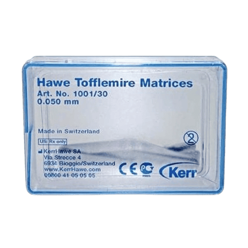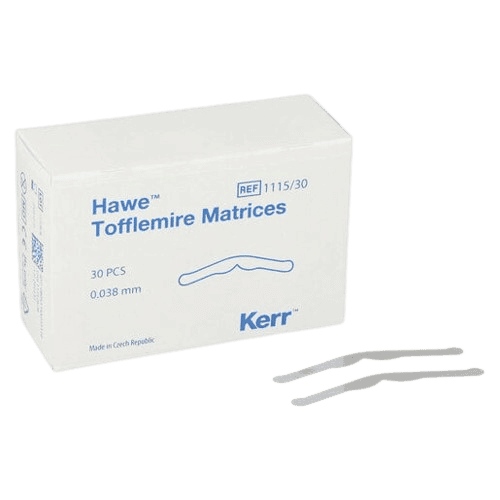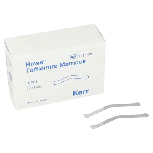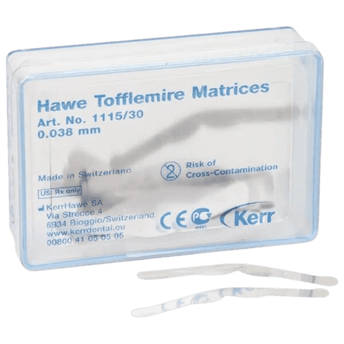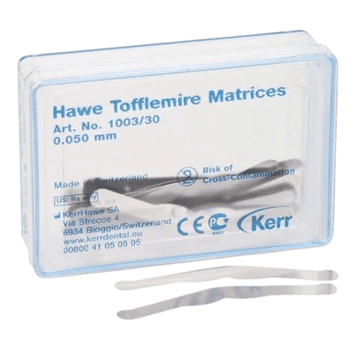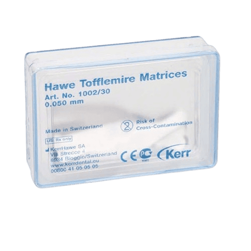 Professzionális Tofflemire matrix csíkok különböző vastagságban és kialakításban, a restaurációk kontrollált formázásához. A választék lehetővé teszi az adott esethez illeszkedő merevség és kontúr kiválasztását, a megbízható kontakt és széli záródás érdekében.